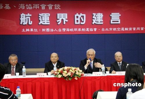 10月30日下午,臺(tái)灣海空航運(yùn)業(yè)界代表由臺(tái)灣海峽兩岸航運(yùn)協(xié)會(huì)常務(wù)顧問、長榮集團(tuán)首席副總裁林省三牽頭,與臺(tái)灣領(lǐng)導(dǎo)人馬英九見面并遞交陳情書,希望即將在臺(tái)北登場的陳云林與海基會(huì)董事長江丙坤會(huì)談能排除萬難,實(shí)現(xiàn)海空直航,促進(jìn)兩岸經(jīng)貿(mào)發(fā)展,造福于民。隨后,他們在臺(tái)北舉行記者會(huì),表示非常歡迎海協(xié)會(huì)會(huì)長陳云林訪臺(tái),并期盼兩岸直航早日落實(shí)。 中新社發(fā) 黃少華 攝