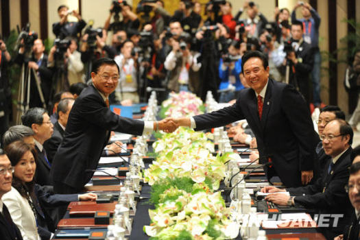 4月26日上午,海峽兩岸關(guān)系協(xié)會會長陳云林與海峽交流基金會董事長江丙坤在南京舉行會談。這是兩會恢復(fù)協(xié)商后領(lǐng)導(dǎo)人第三次會談。新華社記者 韓瑜慶攝