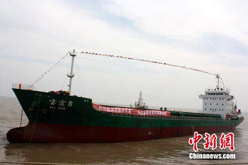 19日上午11時(shí)18分,隨著中共鹽城市委書(shū)記趙鵬一聲宣布,鹽城地方政府官員與臺(tái)灣基隆港物流協(xié)會(huì)會(huì)長(zhǎng)共同啟動(dòng)拉桿,一艘“寶宏8號(hào)”貨輪緩緩離岸駛向臺(tái)灣基隆港,江蘇大豐港與臺(tái)灣基隆港實(shí)現(xiàn)首次直航。