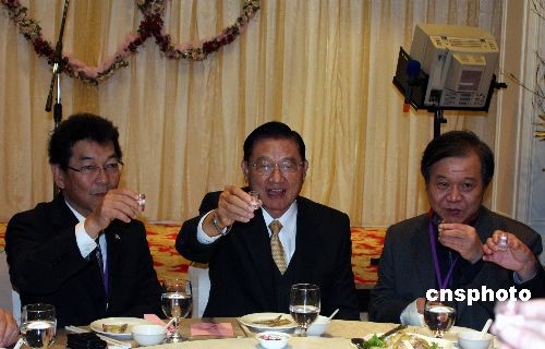海峽交流基金會董事長江丙坤(中)11月26日下午抵達金門,將出席明日舉辦的“福建地區臺商投資權益保障研討會”。他表示,希望兩岸共同打擊犯罪、金融登陸等議題能在六個月內取得成果。圖為海基會晚間宴請出席研討會的福建近百位臺商。 中新社發 周兆軍 攝
