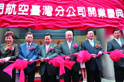 中國國民黨榮譽主席吳伯雄(右三)、海基會董事長江丙坤(右二)等與廈航總經理車尚輪(左三)共同出席廈航臺灣分公司剪彩儀式。