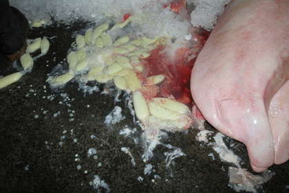 鯊魚(yú)腹中流出胎子,可見(jiàn)是尾已受孕的母鯊。圖片來(lái)自臺(tái)媒