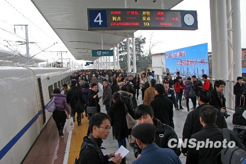 2009年12月26日,武廣高鐵首班車抵達廣州北站。武廣高鐵正式通車運營,標志著中國步入高速鐵路新時代。 中新社發 余明 攝
