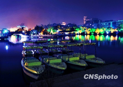 資料圖:放眼兩岸彩燈盞盞溢彩,河上水燈萬盞流金,燈光映水,水染燈色,煙水淼淼,燈影迷離,“桂林山水甲天下”,此言不虛。中新社發 濱海之光 攝