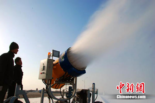 圖為新疆博湖縣工作人員正在加速人工造雪。