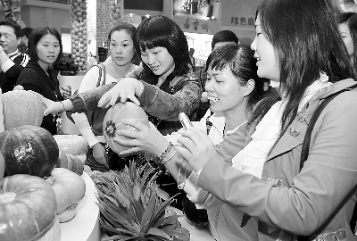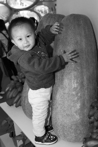 在現(xiàn)代農(nóng)業(yè)“五新”展區(qū),一位來自華安縣的小孩正在與一個巨型冬瓜比比看誰高。 常剛 攝