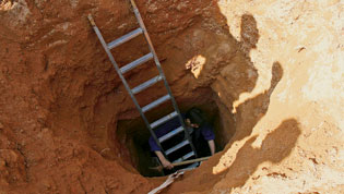 ▲2月26日,打假隊員挖到一個新的地下制假工廠。這是一名隊員借助梯子進入洞口。