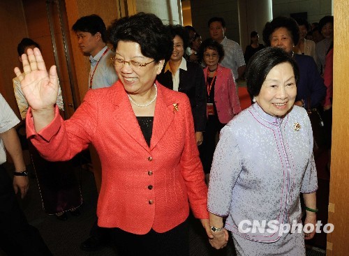 6月20日下午,前來福建廈門參加海峽兩岸婦女交流活動暨海峽婦女論壇開幕式的全國人大常委會副委員長、全國婦聯主席陳至立(左)與臺灣中華婦女聯合會主任委員辜嚴倬云(右)攜手步入該婦女論壇會場。當日,作為第二屆海峽論壇重要活動之一的海峽兩岸婦女交流活動暨海峽婦女論壇在廈門開幕。 中新社發 劉可耕 攝