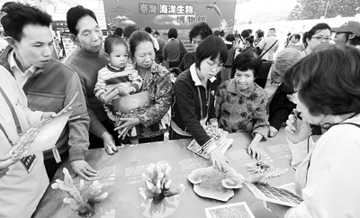 11月2日,海峽兩岸科普嘉年華活動在福州市五一廣場舉行,來自臺灣的8個科普機構(gòu)帶來15個科普演示、互動體驗、動手做游戲等活動項目,30名臺灣科普人員現(xiàn)場講解指導。圖為福州市民參觀臺灣海洋生物博物館展出的珊瑚模型。