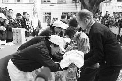 每發放一件物資,志工們都深深鞠躬并送上祝福。