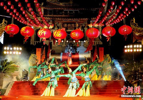 11日晚,福建湄洲媽祖祖廟舉行2011年海峽兩岸慶賞元宵佳節媽祖燈會文藝晚會,兩岸藝術團的精彩表演吸引眾多游客、信眾及島上居民駐足觀看。當日,以“媽祖親緣,情系兩岸;同祈上元,共享升平”為主題的2011年海峽兩岸慶賞元宵佳節媽祖燈會在福建湄洲媽祖祖廟、臺灣云林北港朝天宮同時啟動,此次活動將延續至農歷正月十五。