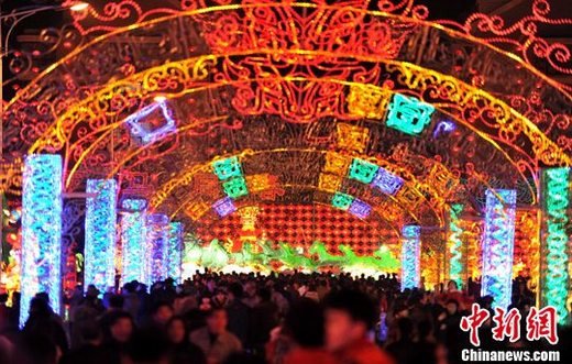 福州馬尾近600萬平方米的兩馬元宵花燈展區內113余組大中小型彩燈、彩門12日晚正式亮燈,以此開啟2011年“兩馬同春鬧元霄”系列活動的序幕。