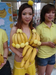 活動現場,美眉穿著“香蕉裝”分送香蕉給民眾,雖然香蕉穿在身上有些重量,但可以幫蕉農促銷香蕉也就不覺得辛苦。