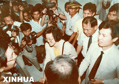 1991年8月12日,新華社記者范麗青(女)作為大陸到臺灣采訪的第一批記者在臺北機場受到臺灣新聞界的歡迎和采訪。