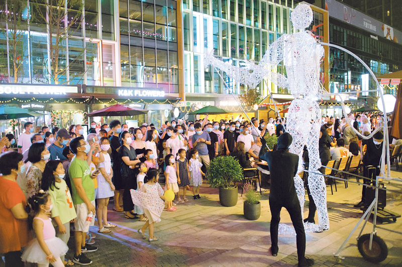 2020年8月8日,北京市朝陽(yáng)區(qū)的“潮朝陽(yáng)”消費(fèi)季活動(dòng)正式重啟。圖為8日當(dāng)晚,市民在望京小街商業(yè)街觀看巨型人偶表演。 新華社記者 陳鐘昊/攝