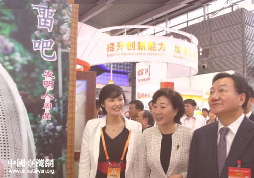 商務部副部長姜增偉(右)、安徽省副省長花建慧(中)參觀畱吧。(圖片來源:安徽省臺聯)