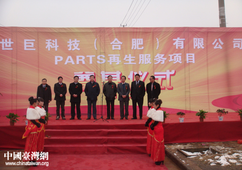 中國(guó)臺(tái)灣網(wǎng)12月31日廬江消息 日前,臺(tái)灣世禾集團(tuán)—世巨科技(合肥)有限公司PARTS再生服務(wù)項(xiàng)目奠基儀式在廬江經(jīng)濟(jì)開(kāi)發(fā)區(qū)舉行。臺(tái)灣世禾集團(tuán)總經(jīng)理陳學(xué)哲、深圳市深超科技投資有限公司總經(jīng)理婁超出席奠基儀式,市臺(tái)辦主任徐延安、廬江縣委書(shū)記王民生、市招商局副局長(zhǎng)梁峰等應(yīng)邀出席并共同為項(xiàng)目奠基培土。