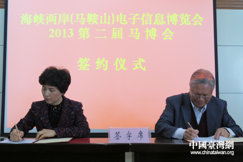 中國臺灣網3月21日馬鞍山消息  日前,安徽省馬鞍山市副市長王曉焱和臺灣電機電子工業同業公會秘書長陳文義在馬鞍山市開發區管委會簽訂協議,共同舉辦海峽兩岸(馬鞍山)電子信息博覽會。