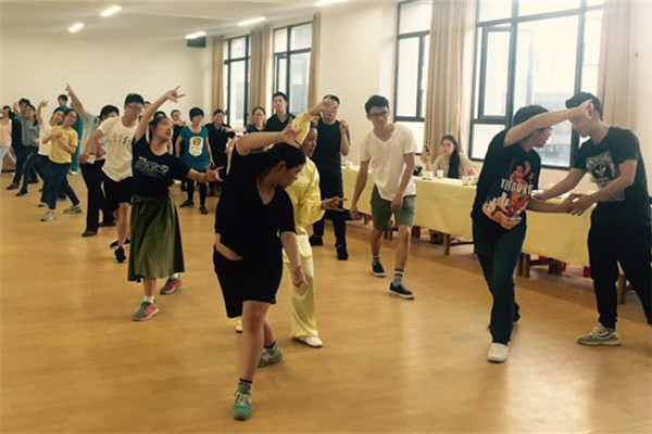 最后一站是在人文與國際教育交流學院四樓舞蹈教室。獲得全國五禽戲比賽冠軍的安徽中醫藥大學四位同學分別給大家演示了五禽戲、易筋經等養生健身功。8月底的合肥暑氣未消,在沒來及安裝空調的房間里,兩個“冠軍”認真的教,二十幾個師生認真的學。揮灑的是汗水,綻放的是青春,凝聚的是友誼。