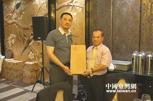 國臺辦海峽經濟科技合作中心副主任肖毅在歡迎晚宴上與參訪團團長蔡武林互贈禮物。(中國臺灣網 王薇 攝)