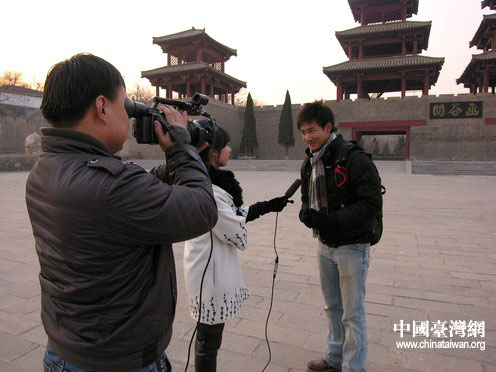 中天電視臺主持人在函谷關前接受三門峽電視臺記者的采訪。圖片來源:三門峽市臺辦