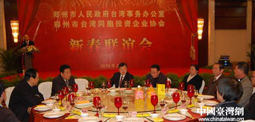 市委常委、統戰部部長王林賀代表市四大班子領導向在鄭臺商、臺胞代表表達了新春的祝福和誠摯的慰問。他說,2009年,鄭州市經濟發展克服重重困難,GDP增長超過了10﹪,這些成績的取得離不開臺資企業和廣大臺商的積極貢獻。市委市政府及各級領導歷來高度關注在鄭臺資企業,關心和支持臺協工作,保障和維護臺商利益,積極為臺商創造優良的投資環境,提供優質高效的服務,幫助和促進臺資企業發展。新的一年里,市委、市政府將把對臺招商引資作為工作重點,把富商安商作為工作重心,以開展臺灣果品博覽會、鄭臺文化交流活動、建設臺商投資園區、臺商投資大廈和臺商生活園區等為依托,吸引更多的臺資企業到鄭投資興業,為鄭州的經濟發展建設作出更大的貢獻。