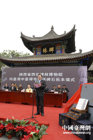 中國臺灣網5月6日西安消息 5月5日,陜西省舉行“西安碑林博物館向臺灣中臺禪寺贈送碑石拓本儀式”。陜西省副省長景俊海、國臺辦交流局局長李維一、西安碑林博物館館長趙力光和臺灣中臺禪寺惟覺長老、中臺禪寺護法總會會長李祖原等出席贈送儀式并發表了熱情洋溢的致辭。