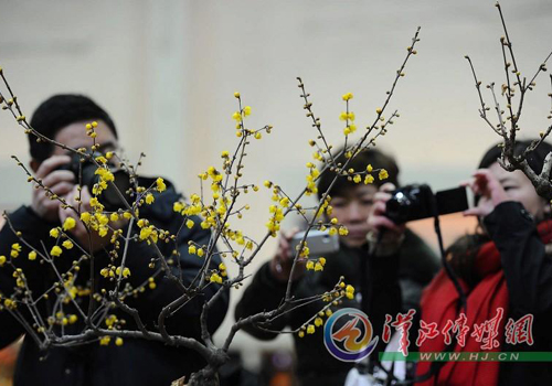 攝影愛好者在保康蠟梅節(jié)上拍攝盆景蠟梅(資料圖片)