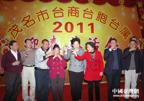 “2011年茂名市臺商、臺胞、臺屬迎春茶話會”上,茂名市副市長林日娣與臺胞、臺屬、臺商共舉杯(圖片來源:茂名市臺辦)
