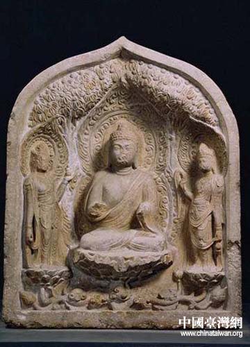 “法門寺地宮與唐代文物大展”在臺北歷史博物館展出圖片——阿彌陀佛三尊像(圖片來源:陜西省臺辦)