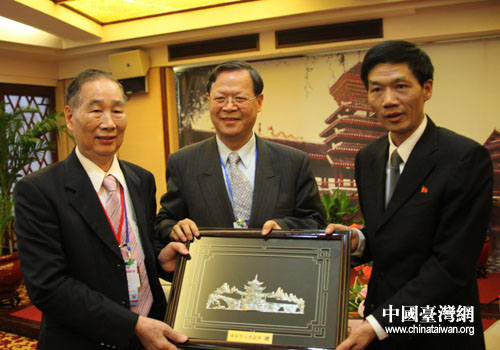 貴州省貴陽市市長李再勇(右一)向臺灣嘉賓贈送帶有貴陽民族特色的紀念品(貴陽市臺辦 胡珊珊 攝
