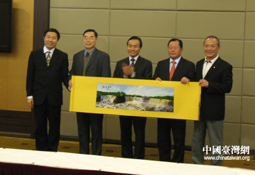 臺灣苗栗縣縣長劉政鴻率領的苗栗縣考察團到牡丹江進行考察訪問。雙方代表互贈禮品,表達情誼,圖為牡丹江贈送的靺鞨繡(圖片來源:牡丹江市臺辦)