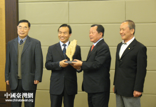 臺灣苗栗縣縣長劉政鴻率領的苗栗縣考察團到牡丹江進行考察訪問。雙方代表互贈禮品,表達情誼,圖為苗栗贈送的木雕(圖片來源:牡丹江市臺辦)
