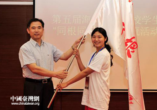 西北農林科技大學副校長侯曦會將“同根·同源”暑期交流活動營旗授予學生代表(圖片來源:陜西省臺辦)