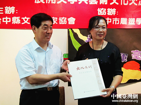 向臺中縣文藝作家協會理事長林美怡贈送《文化東城——書法美術精品集》(圖片來源:北京市臺辦)