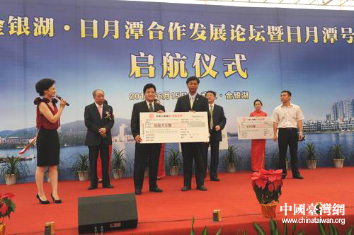 中國(guó)臺(tái)灣網(wǎng)6月15日武漢消息 6月15日,“金銀湖—日月潭合作發(fā)展論壇”暨“日月潭號(hào)”游船起航儀式在湖北武漢舉行,與會(huì)的全國(guó)臺(tái)企聯(lián)常務(wù)副監(jiān)事長(zhǎng)余明進(jìn),丹尼斯集團(tuán)董事長(zhǎng)王任生,武漢市東西湖區(qū)人民政府、東西湖區(qū)金銀湖街道辦事處等單位和個(gè)人得知臺(tái)灣南投縣遭受暴雨災(zāi)害,共向南投縣災(zāi)區(qū)捐款125萬(wàn)元人民幣。