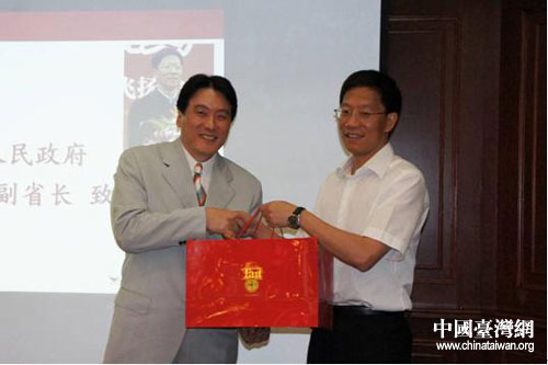 四川省委常委、副省長(zhǎng)鐘勉(右)參觀考察臺(tái)灣統(tǒng)一集團(tuán),與統(tǒng)一集團(tuán)總經(jīng)理羅智先(左)互贈(zèng)交換禮品。圖片來(lái)源:四川省臺(tái)辦