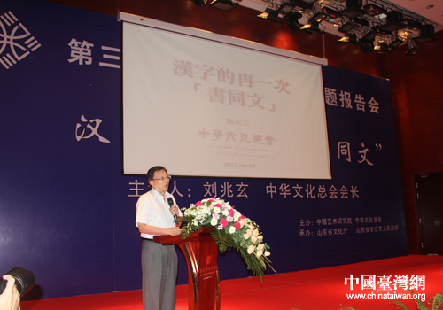 中國臺灣網9月19日棗莊消息 日前,在出席第三屆兩岸漢字藝術節期間,臺灣中華文化總會會長劉兆玄作了題為《漢字的再一次“書同文”》的報告。劉兆玄從“文字是文化的載體”、“漢字是中華文化和文藝復興的載體”和“兩岸共建云端中華語文知識庫”等幾個方面全面而深刻地闡述了“漢字的再一次‘書同文’”的觀點。