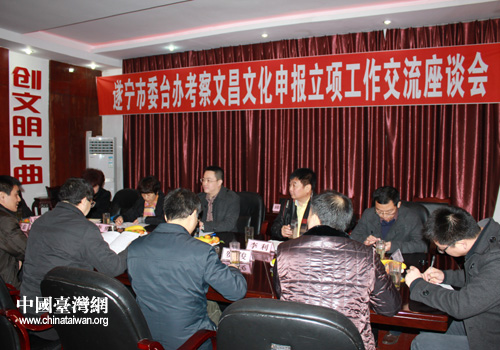 中國臺灣網12月13日綿陽消息 日前,遂寧市委臺辦主任唐統一行來綿陽,就綿陽市梓潼文昌文化申報立項工作及舉辦“海峽兩岸文昌文化交流活動”進行工作座談和實地考察。市臺辦主任陳福林、副主任賀俊,梓潼縣委副書記姜偉、副縣長楊世茹、政協副主席杜登元及梓潼縣臺辦、七曲山風景區管委會、文廣新旅局、民宗辦等有關部門負責同志參加座談和考察交流活動。
