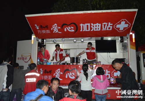 康師傅在蘆山縣設立“愛心加油站”現場為災民及救援人員提供烹煮好的熱泡面。(圖片來源:四川省臺辦)