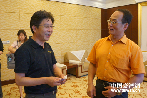 威海市臺辦主任于連波(右一)與臺灣兩岸情經貿交流協會會長王培旺(左一)親切交談。(圖片來源:威海市臺辦)