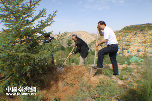 臺灣新黨主席郁慕明親手栽種隴臺親情樹。(圖片來源:甘肅省臺辦)