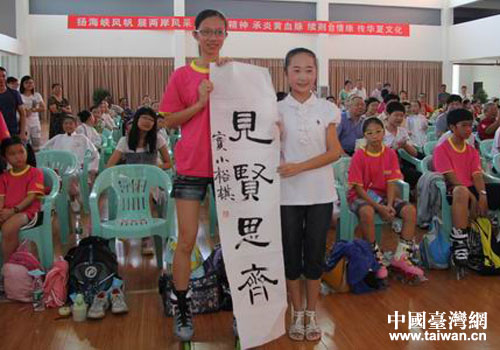 荊門學(xué)生桂裕祺(右)將書法作品“見賢思齊”贈送臺灣學(xué)生高瑭淯(左)。(王啟宏 攝)