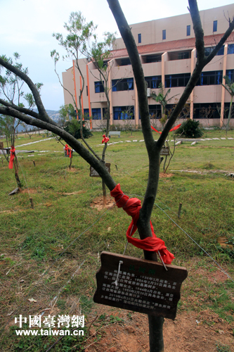 “臺灣相思園”內(nèi),每一棵相思樹都系著紅絲帶,歷經(jīng)風(fēng)雨而不倒。(中國臺灣網(wǎng) 馬迪 攝)