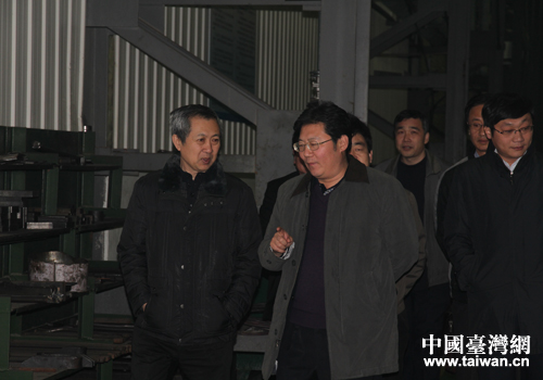曹曉武一行(左)在淄博市臺(tái)辦主任王秀輝陪同下視察臺(tái)資企業(yè)山東國(guó)弘重工機(jī)械有限公司。(圖片來(lái)源:淄博市臺(tái)辦)