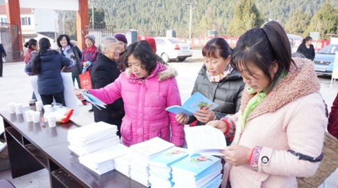 長壽村村民翻閱惠農政策、農業科普宣傳資料