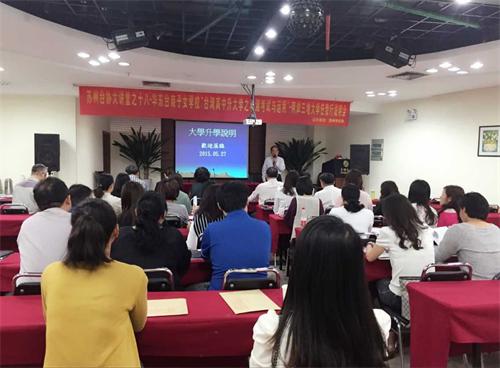 中國臺灣網5月29日蘇州訊 5月27日下午,蘇州臺協舉辦臺協大講堂之十八——華東臺商子女學!芭_灣高中升大學之學測考試與運用”——兩岸大學任我行說明會。特邀華東臺商子女學校副校長鄭京榮,為臺協會員舉辦一場學測說明會。蘇州臺協執行秘書長杜進昌親臨現場并致辭。