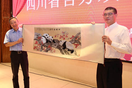 四川省臺辦主任周敏謙向臺灣寺廟金蘭會贈送蜀錦熊貓禮品