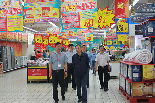 四川省臺辦主任周敏謙(前中)在綿陽臺資企業大潤發超市考察調研。(圖片來源:綿陽市臺辦)