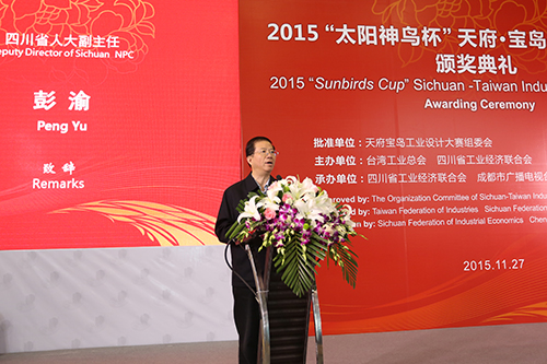 彭渝在致辭中充分肯定了天府·寶島工業(yè)設計大賽在加強川臺兩地交流合作中的重要作用,對其確定的“市場化、國際化”雙翅膀表示了贊賞。他說,四川省正在深入實施“大眾創(chuàng)業(yè)、萬眾創(chuàng)新”戰(zhàn)略,開展了一系列相關活動,天府·寶島工業(yè)設計大賽的持續(xù)成功舉辦,掀起了川臺兩地工業(yè)設計的熱潮,促進了四川與臺灣工業(yè)的創(chuàng)新發(fā)展。他歡迎海內(nèi)外更多優(yōu)秀工業(yè)設計企業(yè)和人才到四川發(fā)展,歡迎更多的優(yōu)秀工業(yè)設計師到四川創(chuàng)業(yè)創(chuàng)新。希望川臺兩地共享發(fā)展的新路,攜手共創(chuàng)互利共贏的美好未來。